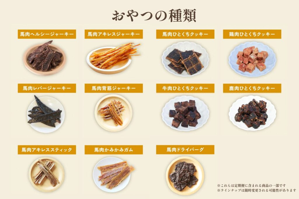 馬肉、牛肉、鶏肉、鹿肉などを使用した、全16種類の無添加おやつの中から、毎月ランダムで商品をセレクトします。 ラインナップには、人気No.1の「馬肉ヘルシージャーキー」などはもちろん、通常はECサイトで販売していない一口サイズのおやつや、一般販売前の新商品が含まれることもあります。「次は何が届くかな?」という楽しみとともに、通常購入では出会えない商品をお試しいただけます。